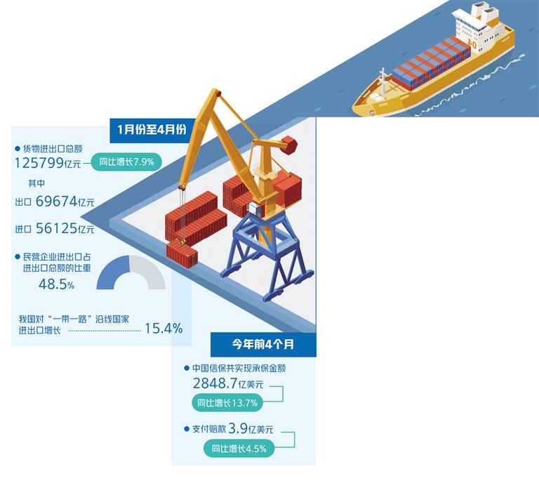 今年3月份以来,国内新冠肺炎疫情呈多点散发态势,防控形势依旧严峻,相关部门不断出台政策全力保障外贸企业开展经营。5月5日召开的国务院常务会议提出,要加大外贸企业信贷投放,支持银行不盲目抽贷、断贷、压贷,梳理一批亟需资金的予以重点支持;扩大出口信保短期险规模;保持人民币汇率基本稳定。最新统计数据显示,1月份至4月份,货物进出口总额125799亿元,同比增长7.9%。其中,出口69674亿元,增长10.3%;进口56125亿元,增长5.0%。民营企业进出口占进出口总额的比重为48.5%,比上年同期提高1.4个百分点。我国对“一带一路”沿线国家进出口增长15.4%,其中出口增长12.9%,进口增长18.6%。