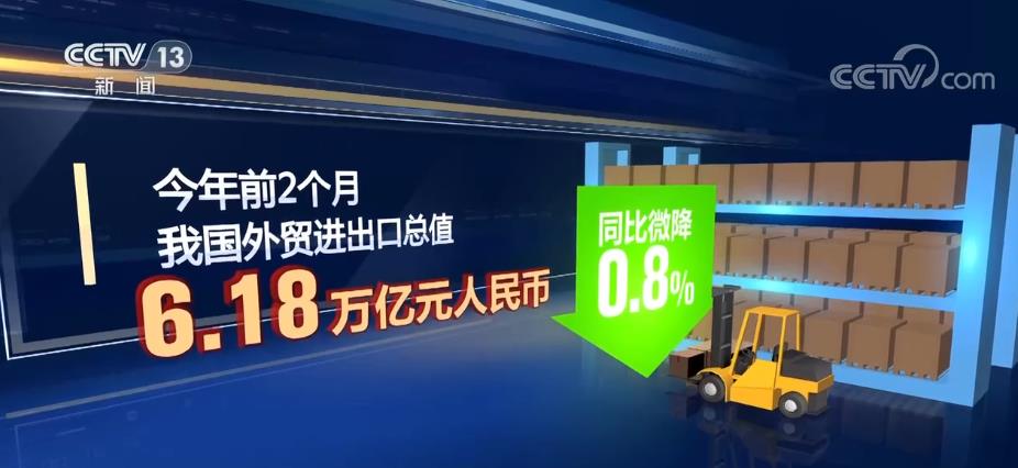据海关统计,今年前2个月,我国外贸进出口总值6.18万亿元人民币,同比微降0.8%;出口3.5万亿元,同比增长0.9%;进口2.68万亿元,同比下降2.9%。