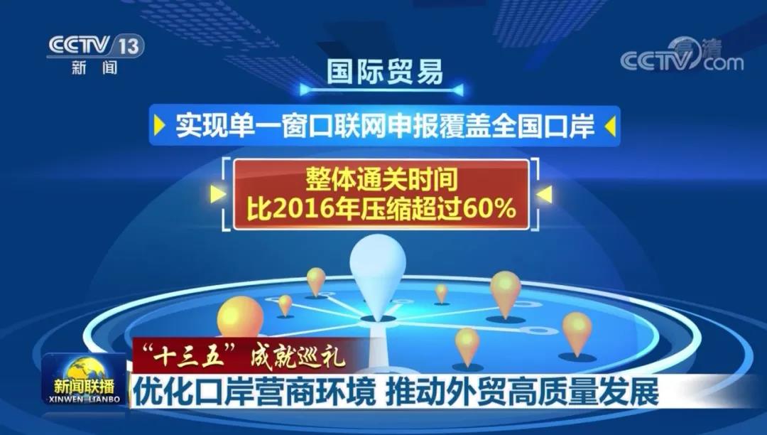 “十三五”期间,海关总署等部门推出了近100项便利通关和促进外贸稳定发展的措施,我国口岸核验的监管证件由86种精简到44种,国际贸易实现单一窗口联网申报覆盖全国口岸,整体通关时间比2016年压缩超过60%。