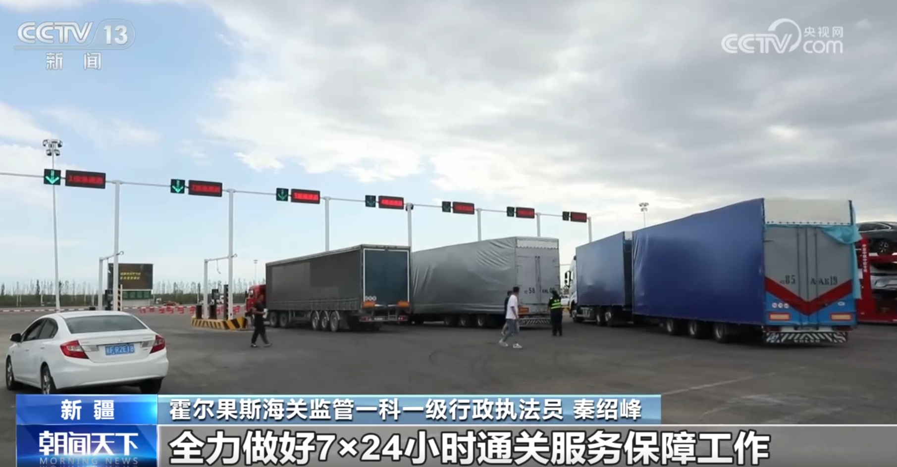 霍尔果斯海关监管一科一级行政执法员秦绍峰称:“我们依托自贸区发展优势,积极推动‘公路口岸+属地直通’模式改革落地见效,采取‘提前申报’‘随时验放’等便利化通关措施,全力做好7×24小时通关服务保障工作,助力进出口货物快速通行。”