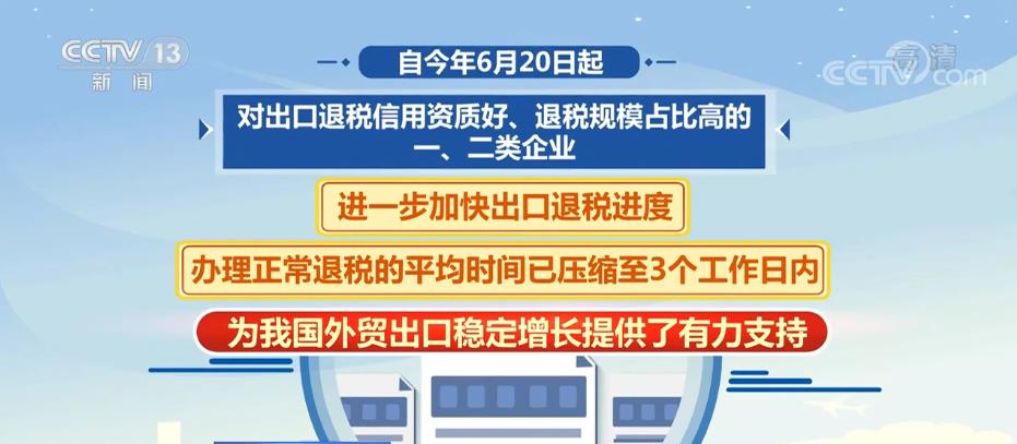 不仅如此,办理退税时间也明显提速。今年以来,全国税务部门为所有出口企业办理正常退税的平均时间已压缩至6个工作日内。自今年6月20日起,对出口退税信用资质好、退税规模占比高的一、二类企业进一步加快出口退税进度,办理正常退税的平均时间已压缩至3个工作日内,为我国外贸出口稳定增长提供了有力支持。