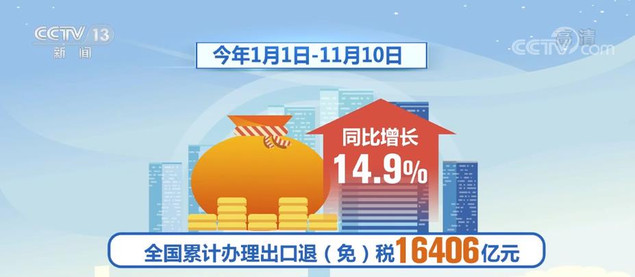 税务总局数据显示,今年1月1日至11月10日,全国累计办理出口退(免)税16406亿元,同比增长14.9%。