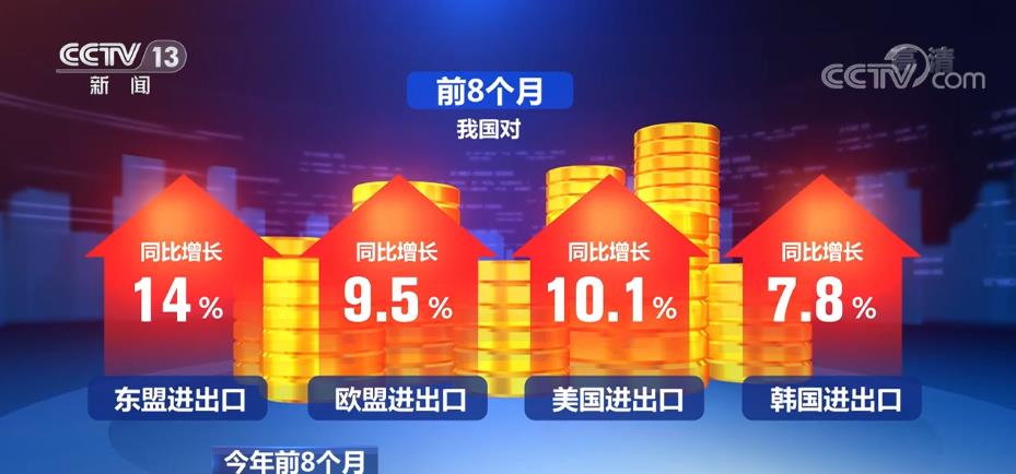 据海关统计,前8个月,我国对东盟、欧盟、美国、韩国进出口同比分别增长14%、9.5%、10.1%和7.8%。东盟继续为我国第一大贸易伙伴,占我国外贸总值的15%。