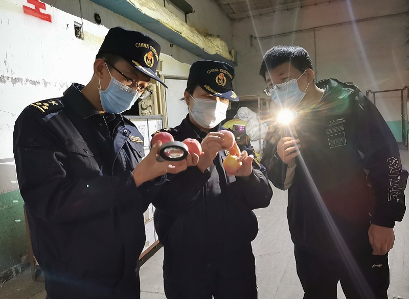 图为:关员在企业冷库对出口鲜苹果开展属地查检 刘舒蓉/摄