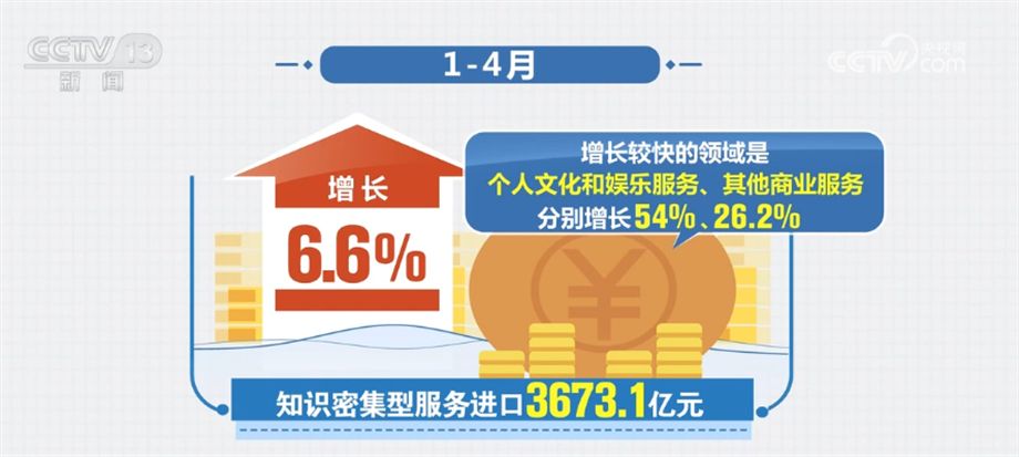 知识密集型服务贸易占比提升。1—4月,知识密集型服务进出口9057.9亿元,同比增长13.1%,占服务进出口总额的比重达43.5%,较上年同期提升1.5个百分点。其中,知识密集型服务出口5384.8亿元,增长18%;增长较快的领域是保险服务,增幅达260.5%。知识密集型服务进口3673.1亿元,增长6.6%;增长较快的领域是个人文化和娱乐服务、其他商业服务,分别增长54%和26.2%。
